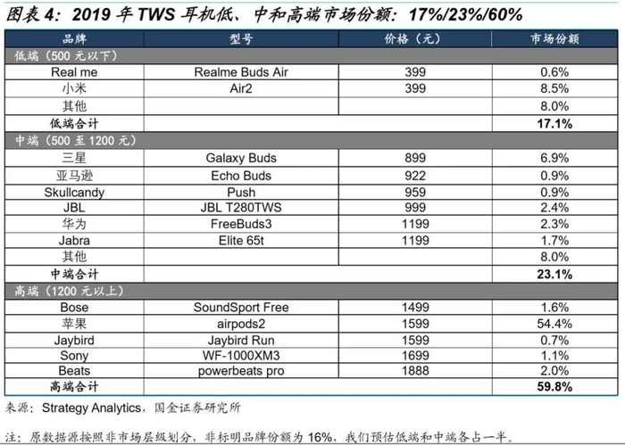 VR设备“配件化”与“低价化”,或将打开大众需求市场。未来VR设备作为一般用户智能配件,类似于“耳机”等智能配件,用于辅佐一般娱乐用途,其在价格和市场份额上也会与产品智能化与制造复杂度更类似的真无线(TWS)耳机趋同。我们预期移动VR价格下降到2000元以下,能够引发大众用户需求爆发,预估移动VR低、中和高端市场份额分别为17%/23%/60%。