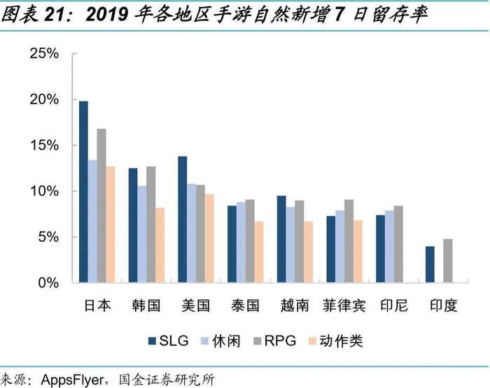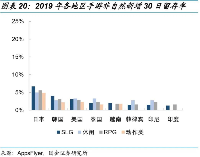 提高用户粘性:日本、韩国和美国玩家留存率较高,粘性更强,2019年手游各品类平均自然新增30日留存率分别为6.8%、3.8%和3.6%。根据AppsFlyer数据统计,2019年日本、韩国、欧美和东南亚地区从手游非自然新增7日和30日的留存率来看,日本、韩国和美国各品类手游的留存率分列前三;从手游品类来看, SLG类游戏在日本、韩国和美国的非自然新增的留存率较高,东南亚地区(包括泰国、越南、菲律宾、印尼和印度)休闲游戏的非自然新增的留存率较高。而从手游自然新增7日和30日的留存率来看,日本、韩国和美国仍处于前列;从手游品类来看,在日本、韩国、美国和东南亚地区SLG和RPG类游戏留存率较高,自然新增的玩家留存率在各地区间对于手游品类层面没有明显差异。