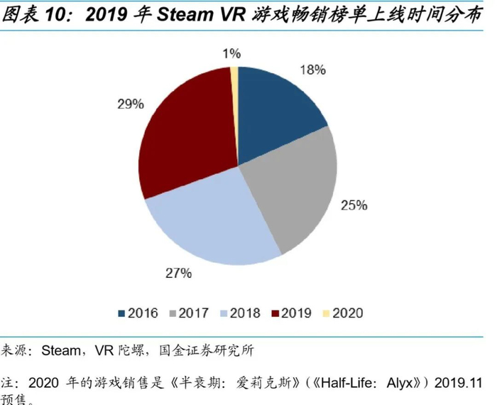 休闲VR游戏相对开发周期较短,而重大IP游戏开发周期是休闲游戏约2倍以上,预计以哈视奇为代表的VR游戏厂商受益明显。以Steam VR游戏隔代上线周期作为开发周期的指标,各品类游戏研发周期平均约1.75年,整体位于半年至4年区间内,相比于国内手游并没有显著差异。根据我们对Steam上有多代的VR独占游戏产品上线时间进行统计,分具有模拟、运动/动作、休闲和冒险类型标签(不排重)来看,Steam VR独占游戏隔代的上限周期分别为1.66、2.33、1.96和1.34年。以VR游戏行业内个别游戏案例来看,2020年3月24日上线的3A级作品《半衰期:爱莉克斯》的研发时间约4年,如果精细度达到如此级别,VR游戏的研发周期则在上述开发周期统计区间上限。而国内手游隔代的上线周期平均约2.77年,整体位于半年至5年的区间内。根据我们的统计,分休闲、卡牌、RPG、FPS、MOBA和二次元类型来看,国产手游隔代的上线周期分别是1.93、3.54、2.87、0.70和3.83年。如果不考虑到国内手游版号的不确定性,我们判断两者实际各品类开发周期可能并没有显著差异。