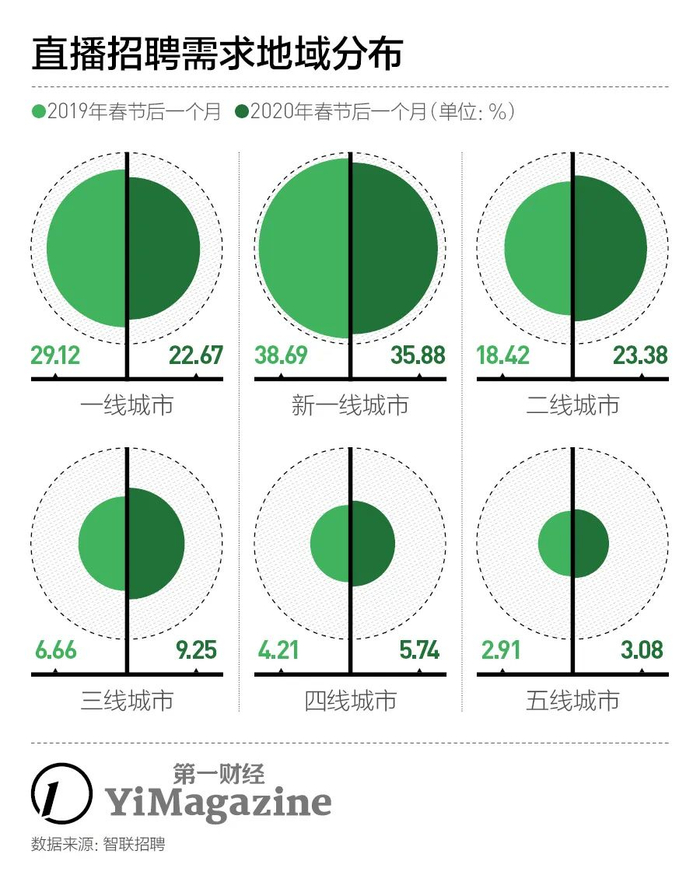 直播产品的优化,以及5G技术的普及,将进一步降低直播门槛,淘宝、快手等大公司针对助农、老铁文化等方向的运营策略,带动整体直播人才需求扩展到下沉市场。根据智联招聘的数据,今年春节后一个月,一线与新一线城市的招聘职位数占比缩小,二者较去年同期共下降10%,同时二到五线城市相对扩张。