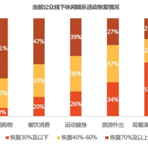 接近七成的受访者表示已经处于“正常上班”状态,公众生活正在逐步进入正轨。从线下活动的恢复情况来看,“商场购物” 恢复度较高,有六成以上的用户身边“商场购物”恢复度在70%以上;其次是“餐饮”,可以预期疫情后餐饮服务行业会迎来反弹增长行情。属于休闲娱乐业的“旅游”、“演出”、“展览”等显示出了非刚性消费的特质,恢复度较低,尤其是针对演出行业半数以上受访者积极性不高。