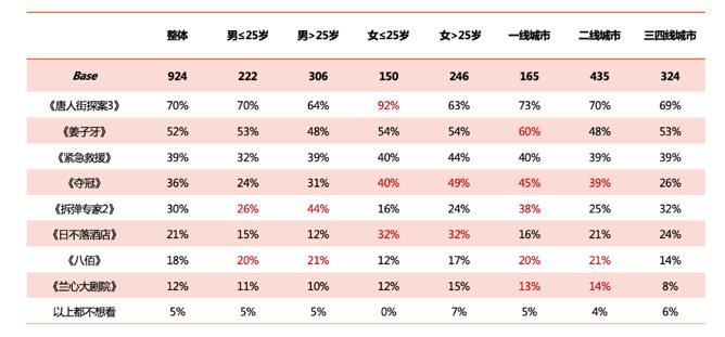 一二线城市观众对国内新片上映期待度更高。根据调研结果来看,春节档影片热度未减,在可接受4月份去影院观影的人群中,想看国内影片排名前四位均为春节档电影,依次为《唐人街探案3》《紧急救援》《姜子牙》和《夺冠》。