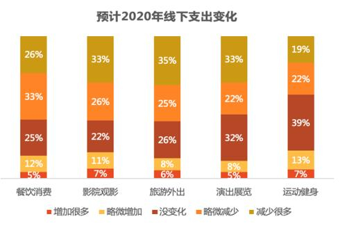 由于收入明显降低,大部分受访者对2020年线下消费持比较谨慎的态度,除“运动健身”外,六成左右受访者将减少用于“餐饮消费”、“影院观影”、“旅游外出”、“演出展览”方面的支出。其中影院观影支出的减少比例达到59%。
