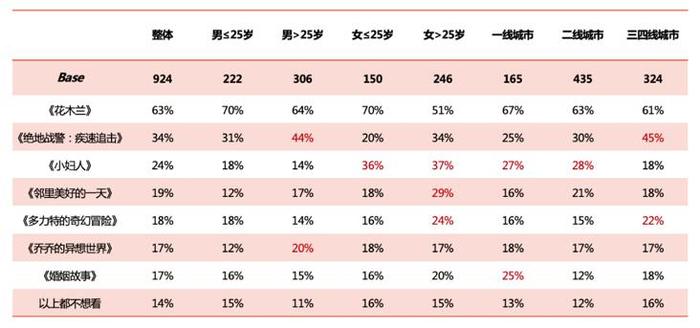 年长观众对国外新片的兴趣度更高。在可接受4月份去影院观影的人群中,想看国外新片排名前三位依次为《花木兰》《乔乔的异想世界》和《绝地战警:疾速追击》。从所给出的国外新片片单喜好度来看,年长观众对国外新片喜好度更高。
