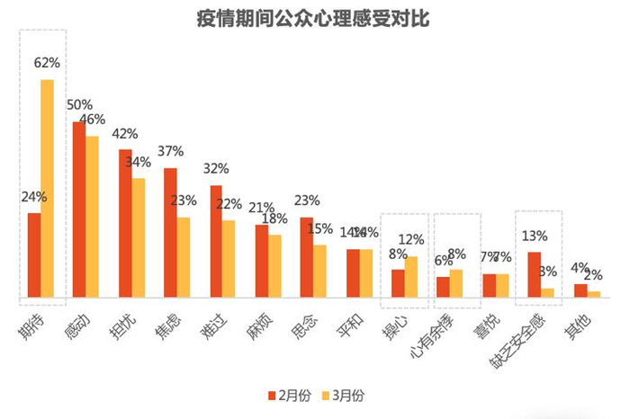 经过两个月的抗疫,公众对疫情结束的“期待”提升显著,位列3月份公众心理感受首位,焦虑、担忧、难过等情绪均有所下降,随着各地各行各业陆续复工复学,防范和担忧心理尚未完全消除,但总体积极乐观,“安全感”也上升了10%。