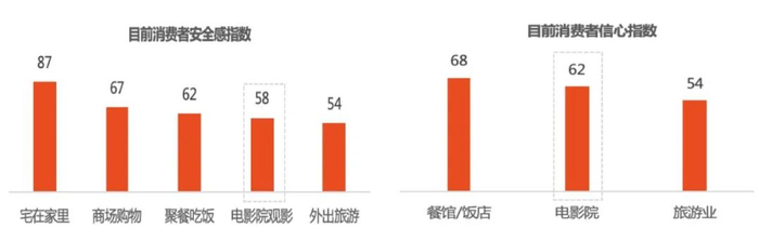 在消费安全感上,受访者对“宅在家里”的安全感最高(87分),其次为“商场购物”(67分)、“聚餐吃饭”(62分),“电影院观影”得分为58分,“外出旅游”最低。在消费信心上受访者对电影院消费的信心得分为62分。总体上看,公众对影院观影的安全感和信心低于餐饮业,但高于旅游业。