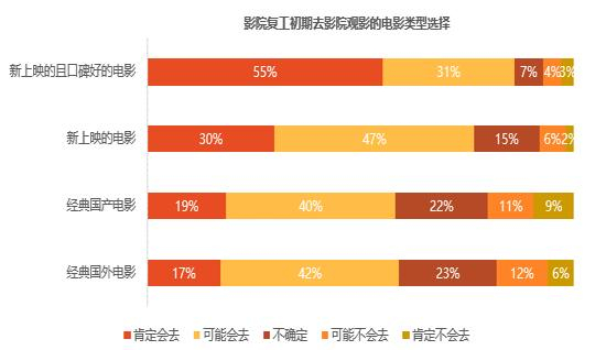 对于未来影院营业,“新上映且口碑好的电影”表示“肯定会去”的受访者接近六成;重映“经典国产电影 ”、“经典外国电影”表示“肯定会去”的接近两成。这说明新片是拉动影院消费的重要因素。如何安排协调延期改档的新片有序合理上映,落实政策恢复片方信心,是主管部门与行业协会需要共同努力解决的首要问题。