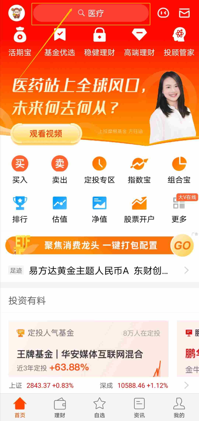 在首页搜索框输入你要查看的基金名称或基金代码。