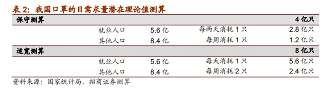 2019年11月公布的第四次全国经济普查数据显示,2018年末,全国法人单位和个体经营户合计从业人员为5.33亿人,其中第二产业2亿人,第三产业3.3亿人。若全面复产,按每人每天一只口罩计算,至少每天需要5.3亿只口罩;其他非劳动力,虽然不频繁出门,保守按每周用一只的口罩需求量计算,每天也需要1.2亿只。所以,14亿人的口罩日需求量远大于5.3亿。
