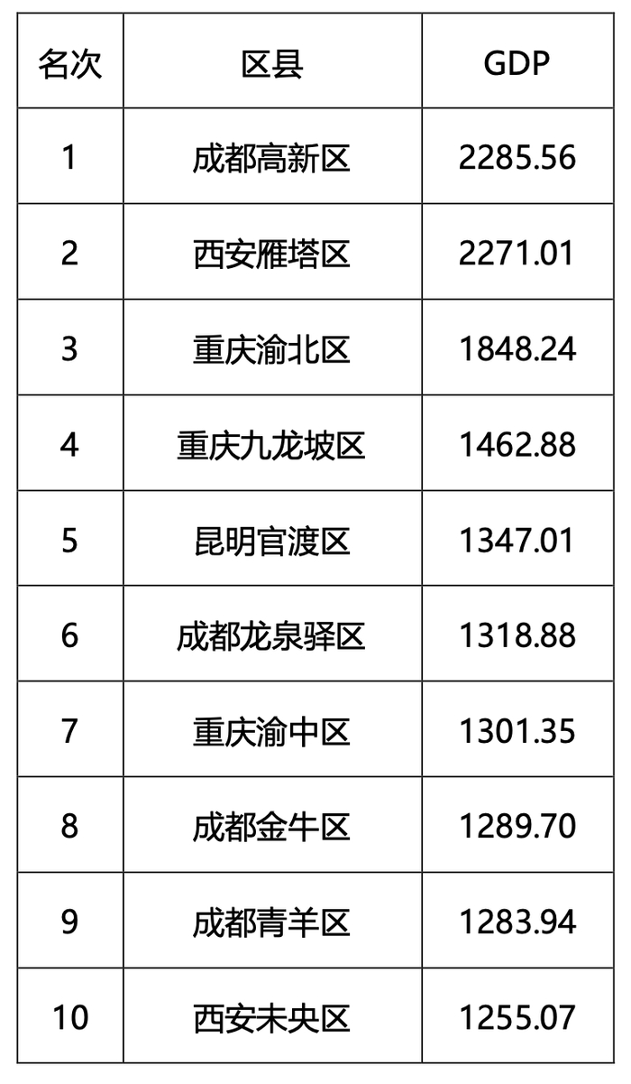 目前西安GDP主要贡献者来自雁塔区、未央区、碑林区,三区之和的经济总量就已占据全市一半。2019年,这三个区加上长安区,是西安仅有的四个千亿俱乐部成员。但是,成都辖区GDP超过千亿的有7个区,重庆也有6个区进入千亿俱乐部。