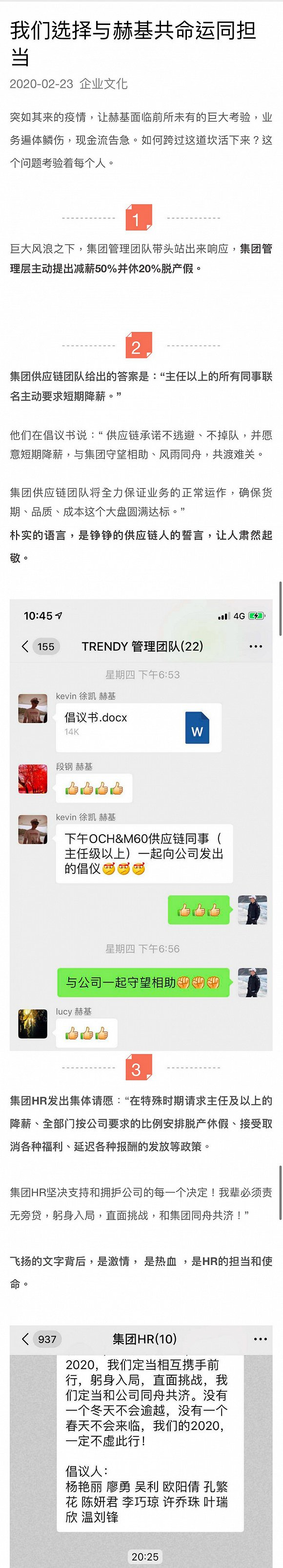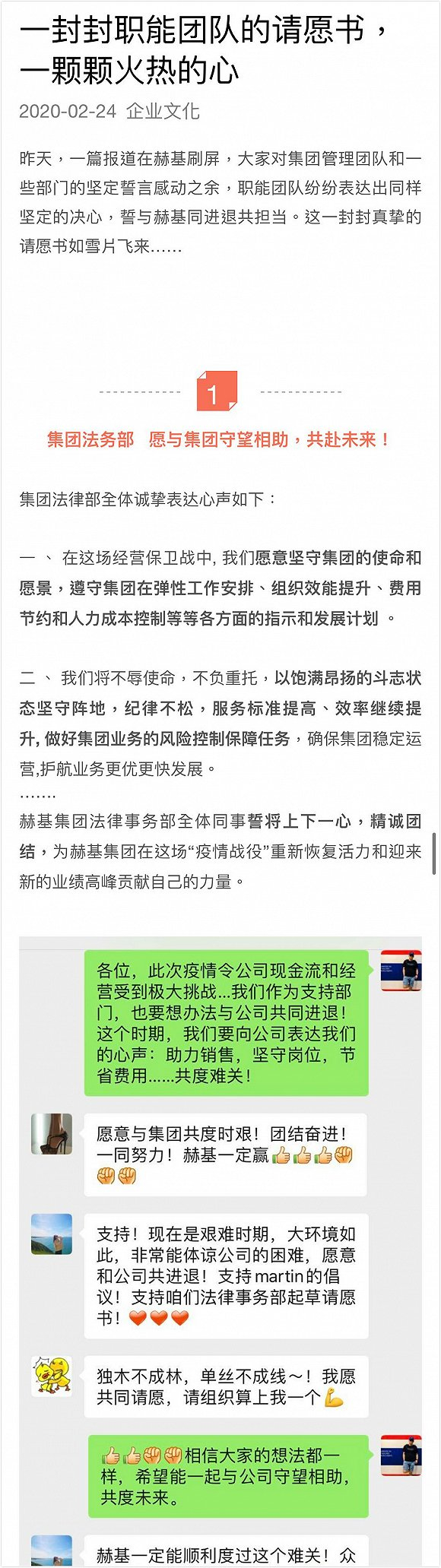 2月24日,赫基集团内部再次发文《一封封职能团队的请愿书,一颗颗火热的心》,放出各部门响应号召的微信聊天截图,表示有更多部门加入自愿降薪行列。