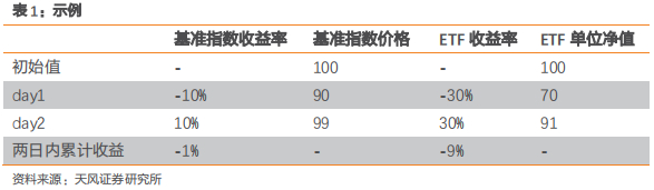 举个简单的例子进行说明,假设不考虑所有的交易成本,一个基准指数的前收盘价为100,当日下跌10%,收盘点位为90。另有一只3倍杠杆ETF跟踪该基准指数,并且前一日该ETF的单位净值也为100,由于基准指数下跌10%并且杠杆为3倍,因而该ETF当日收盘后的单位净值为70。假设第二日基准指数上涨10%,则该指数的收盘价为99,3倍杠杆ETF的单位净值为91。两天内基准指数和ETF的累计收益分别为-1%和-9%,虽然我们买入的是一只三倍杠杆ETF,但两日内该ETF就有了9倍的杠杆。然而很多投资者会错误地认为该区间内ETF只应下跌-3%。