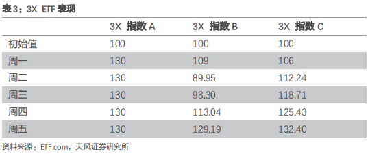 2)指数A和指数C的累计收益率相同,但指数C的收益率波动要低于A,最终跟踪指数C的3X ETF的期末净值要高于指数A;
