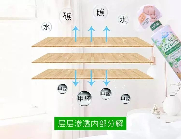 其有效成分颗粒小,纳米级超微粒子能够渗透到材料中,直达粘合剂处,从根源去除甲醛持续发挥效果。