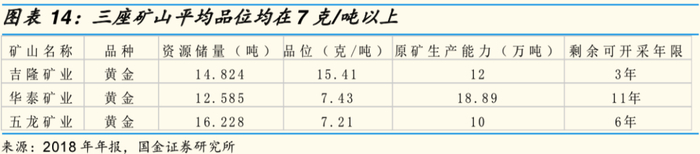 根据公司 2019 年债券评级报告,2018 年公司原矿产量 38.39 万吨、同比 增加 21.51%,黄金产量 1.51 吨、同比减少 26.56%,延续了产量下滑的趋势。在原矿处理量增加的背景下,在采矿环节,黄金产量下降主要与入选品位下降 有关。2013-2016 年由于吉隆矿业和五龙矿业处于利润承诺期内,同期黄金价 格单边下行,为了保证完成利润承诺,公司较多采用高品位矿石,导致三级矿 量不平衡,探矿储备不足。除了采矿环节的影响外,选厂改造对产量也有一定 影响。2017 年国家环保要求提高,氰渣被列入危废名录,公司对吉隆矿业、华 泰矿业的选厂进行技改,增加了脱氰工艺,导致选厂停产一个月。