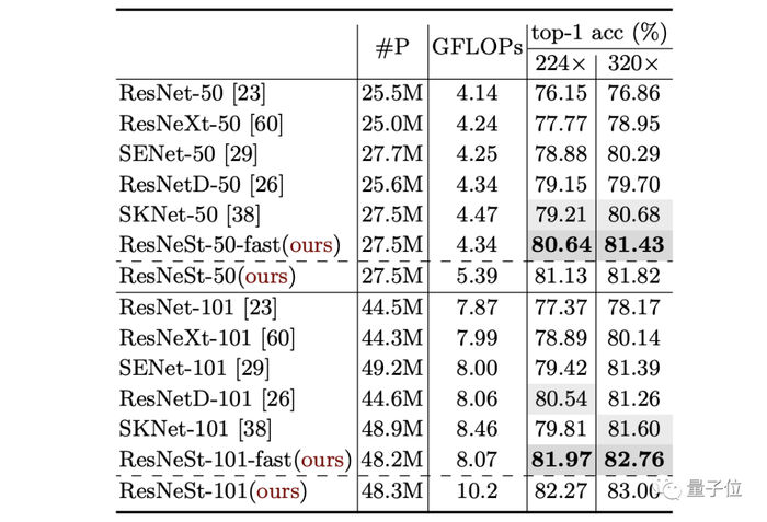 通过将ResNeSt和其他50层和101层配置、类似复杂度的ResNet变体作比较,TOP-1精度达到了最高,如下表所示。
