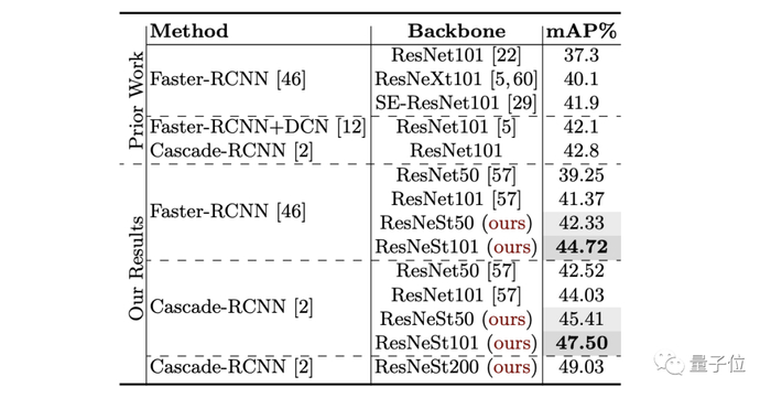 对于Cascade-Mask-RCNN,切换到ResNeSt50或ResNeSt101所产生的增益分别为3.13%/2.36%或3.51%/3.04%。