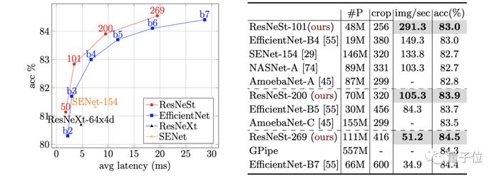 从下表不难看出,与基于NAS发现的模型相比,ResNeSt具有更好的准确性和延迟权衡。