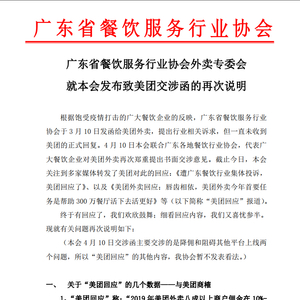 对于广东餐饮协会的发函,美团外卖在4月13日进行了回应,称唇齿相依,美团外卖今年首要任务是帮助300万家餐厅活下去、活更好。