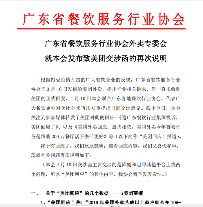4月10日下午,广东餐饮协会官微发文《广东餐饮行业致美团外卖联名交涉函》。广东餐饮协会联合广东各地餐饮行业协会,代表广大餐饮企业对美团外卖再次郑重提出交涉意见。