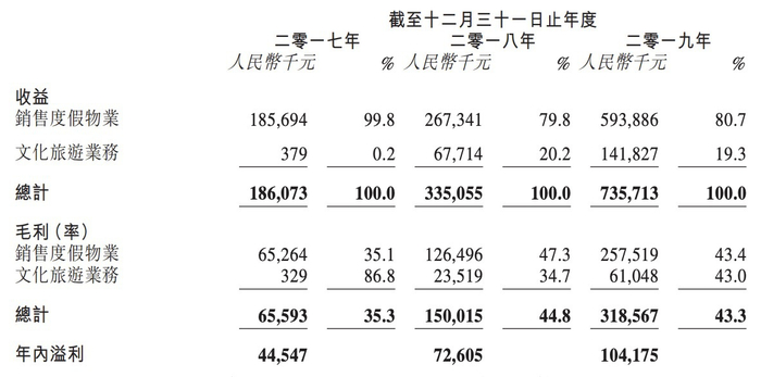 据招股书披露显示,中国文旅集团2017年、2018年及2019年度总收入分别为1.86亿元、3.35亿元、7.35亿元。其中销售独家物业收入占比分别为99.8%、79.8%及80.7%。
