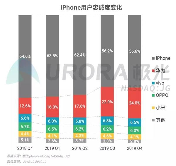 极光大数据显示,2019年第四季度iPhone用户忠诚度为56.6%,基本与上一季度持平,结束连续3个季度下滑的趋势;iPhone用户换机选择华为手机的比例进一步提升,占比达24%。