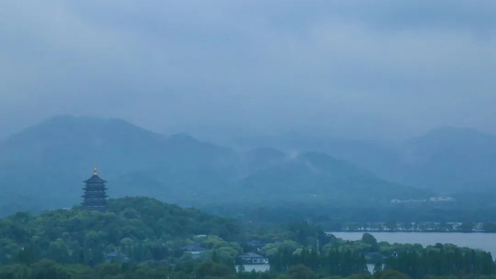 西湖东南面的凤凰山,已是葱葱郁郁,山下五代吴越国名刹梵天寺古迹经幢高大雄伟,挺立于山坡上,历史的沧桑和雕塑艺术的细腻融合一体;山脚下民居小铺聚集,人间烟火暖人心。西湖南山延伸处的吴山天风,登上城隍阁远眺,杭城尽收眼底。