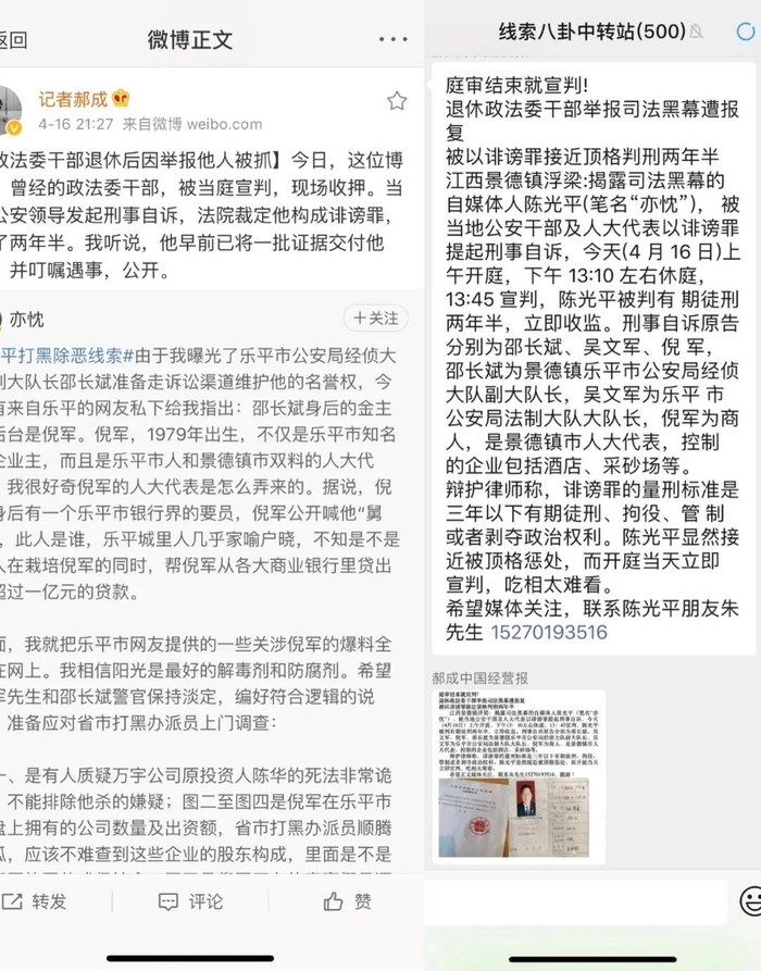 江西景德镇市中级人民法院退休干部陈光平,因发文质疑乐平市警方办理的万宇城案,被乐平市公安局两名大队长及一名商人告上法庭,该案为刑事自诉,起诉罪名为诽谤。4月16日上午9:00,该案在江西省浮梁县人民法院开庭审理,13:10休庭,13:45即宣判。陈光平因诽谤罪被判有期徒刑两年半,当庭即被收监。知名调查记者郝成16日通过微博率先发布了这一消息,引发关注。