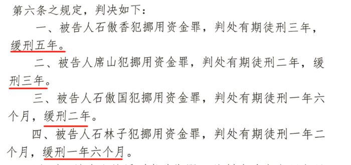 《华夏时报》记者掌握的判决书显示,2020年1月19日(农历春节前6天),四名遭羁押15个月的被告人,被以挪用资金罪分别判处有期徒刑,缓期五年到18个月执行。