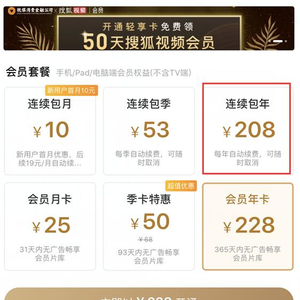 但很多在线视频平台并没有相应减少消费者支付。比如搜狐视频,会员价格一年228元,连续包年208元,降价幅度显然没有15%。