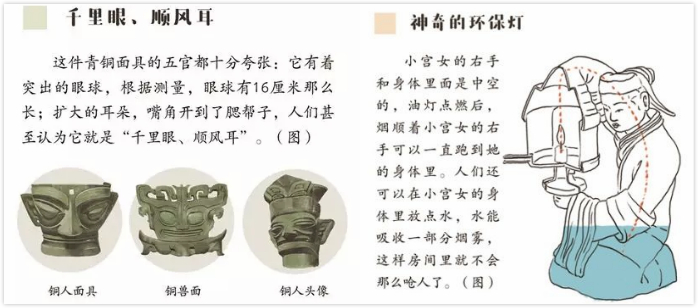 比如,将三星堆的青铜雕塑比作“千里眼”、“顺风耳”;
