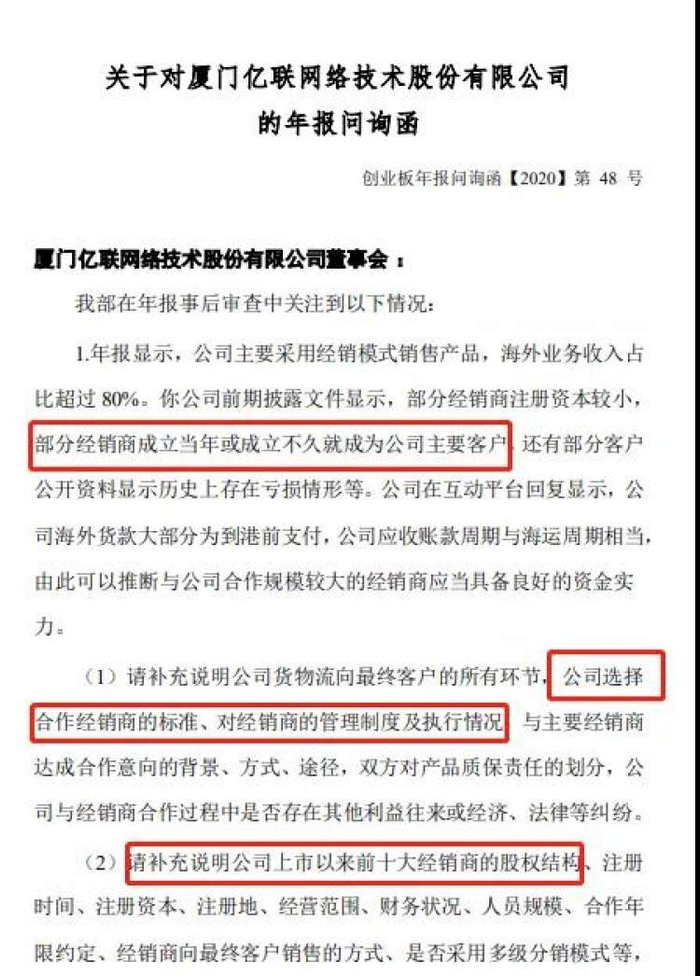 上市3年股价最高涨幅近10倍,目前总市值525亿元。不过其收入几乎来自海外市场,毛利率、净利率超高等受到质疑。4月18日,亿联网络收到深交所年报问询函,就经销商选择标准以及对经销商管理执行情况等发出20问。这是继去年该公司半年报后再次被问询。