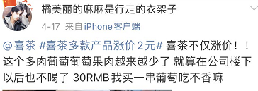 《商学院》记者打开小程序“喜茶Go”看到,目前多肉葡萄售价为30元,芝芝莓莓售价为32元。除这两款饮品外,喜茶多款饮品价格超过30元。此外,记者看到数位微博网友评论,“喜茶涨价就算了,一杯多肉葡萄加起来不超过三颗葡萄”、“喜茶不仅涨价,多肉葡萄果肉越来越少”、“涨价没涨价没注意,多肉葡萄里基本没有葡萄倒是真的”。
