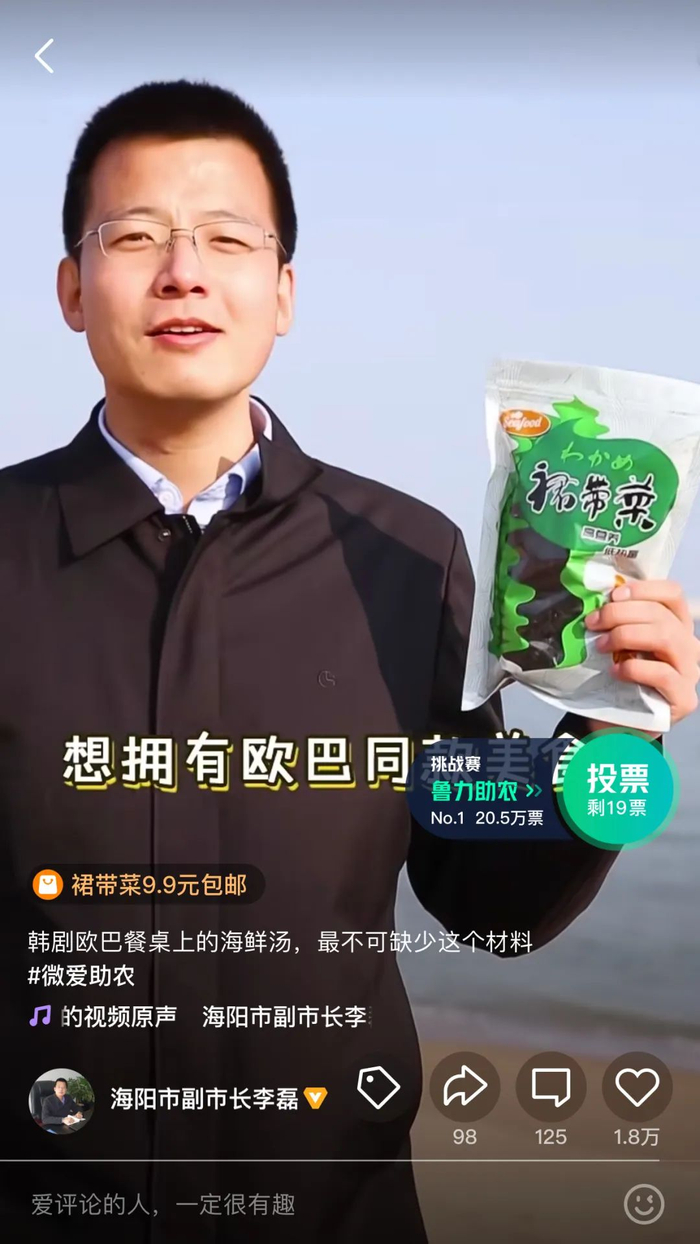 李磊:为了缓解新冠疫情带来的影响,在山东省商务厅等多个部门的指导下,腾讯微视联合贝壳视频、山东广电推出“这就是山东·鲁力助农”的活动。主要就是邀请山东的百名县长为自己家乡的农产品站台推广,打通产品销路。