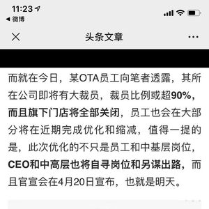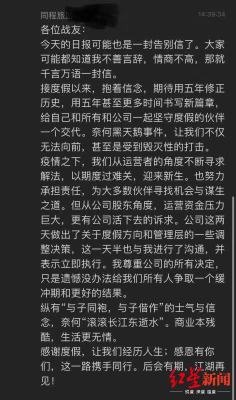 同程国旅CEO杨佳佳昨日发布内部告别信称:“疫情的黑天鹅事件,让我们无法向前,甚至是毁灭性打击。从公司股东角度,运营资金压力巨大,更有公司活下去的诉求,公司这两天做出来关于度假方向和管理层的一些调整决策,我尊重公司的所有决定,只是遗憾没办法给我们所有人争取一个缓冲期和更好的结果。”