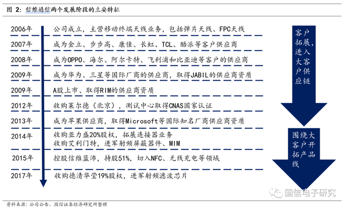 信维的客户升级之路。公司成立之初,主营业务为移动终端天线,包括弹片天线、FPC天线等。2006-2009年,公司逐步成为金立、OPPO、华为、三星等客户的供应商,伴随客户的不断发展壮大,公司逐步实现A股上市。2012年收购处于困境中的北京莱尔德,进军高端LDS天线。在2013年成功成为A客户的供应商。