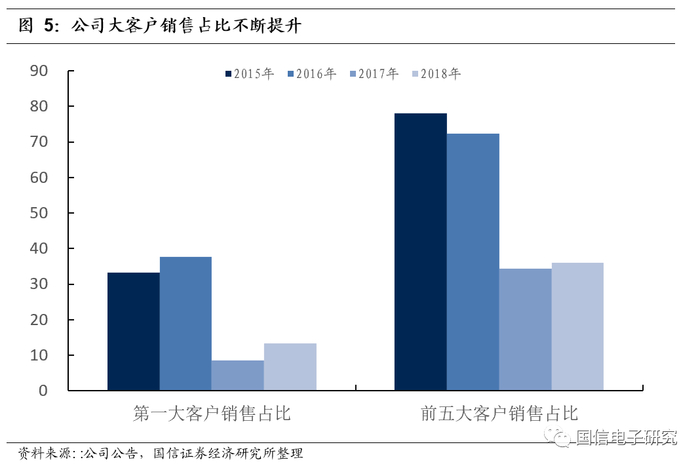 根据公司公告,公司2013年被选为A客户供应商,当年最大客户销售收入占比约为28%,之后随着公司占大客户份额的增长与产品种类的增加,来自A客户的销售占比不断增加,到2016年底为38%,接近40%。自2014年以来,来自前五名客户的销售总额占比始终超过70%。17年后公司前五大客户改用实际交货对象统计,若按同比口径统计,17年前五大客户销售占比为63.41%。