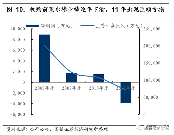在收购之前,莱尔德是业内排名第一的天线公司,依靠诺基亚成长壮大,一度掌控全球三分之一的份额。然而诺基亚的衰落让莱尔德营收下滑严重,甚至开始出现巨额亏损,2011年一度亏损3900多万。信维在收购莱尔德时仅花费1.73亿元,对应市净率1.3倍,在电子行业可以说是非常低的价格。