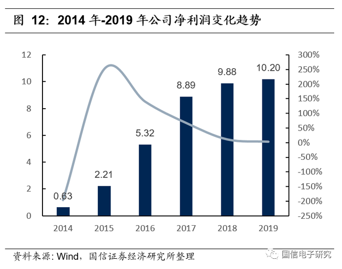 14年-18年收入从8.08亿增长至47.07亿元,复合增速55%;净利润从0.63亿元增长至9.88亿元,复合增速95%。2018年-2019年公司进入新产品的过渡阶段,公司持续布局射频前端、高端连接器等受益5G趋势的创新产品。5G时代带动消费电子射频端价值量的大幅提升, 2020年之后的未来几年,公司布局的射频前端、高端连接器等放量有望带动公司新一轮腾飞。