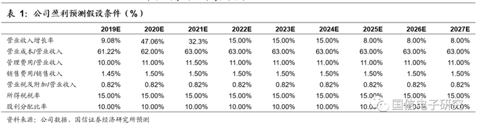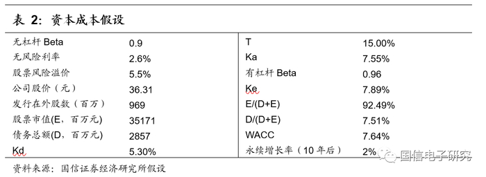 我们采用 FCFF 估值法对公司进行绝对估值,考虑公司目前多个业务处于放量期,随着常州工厂产能的逐步落地,公司的营业收入和产能的释放,以及5G带动的行业需求的爆发,我们出于保守考虑,2021年后整体维持15%左右增速,2024年后保持8%的增速。毛利率保持稳定。盈利预测假设条件和资本成本假设条件如下表所示。
