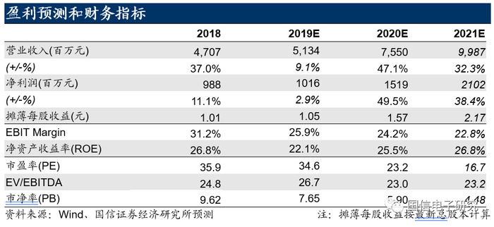 相比可比公司20年平均估值31倍,公司相比业绩增速更快,且目前动态估值为23倍左右。5G周期公司业绩持续增长能力更强,预计20-21年公司归母净利润分别为15.19亿元、21.02亿元,增速分别为49.5%、38.4%,EPS分别为1.57元、2.17元,对应20年-21年动态PE 23.2倍、16.7倍,维持“买入”的评级。