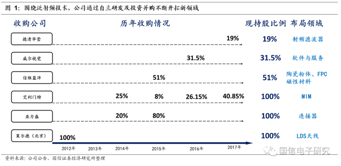 2012年-2015年通过收购莱尔德(北京)进入三星、苹果等国际客户供应链,并以手机天线产品为基础,拓展至iPad、Macbook等产品天线。收购莱尔德之后,公司获得一个全球化的平台,带动公司服务能力,项目管理能力等方面都提升一个很大台阶。通过后续持续努力,公司客户逐步覆盖到全球最顶尖的苹果、三星、亚马逊、微软等客户。