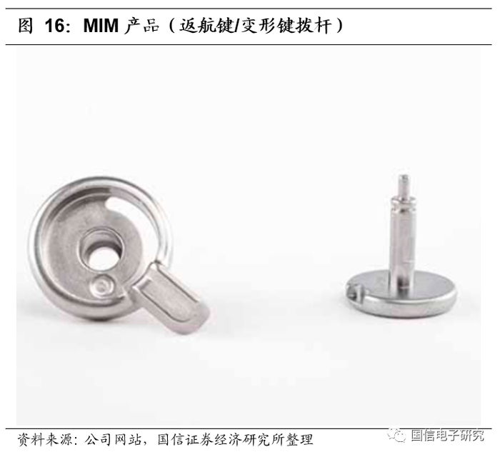 在此过程中,公司持续在提升在精密器件、精密五金零部件上的能力,例如收购艾利门特公司。艾利门特产品应用包括移动终端产品的外观、结构的金属零部件,如侧面按键、摄像头装饰圈、卡托等。MIM产品特别是在目前手机产品金属结构件和天线一体化方面具有明显优势。