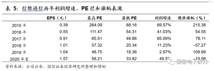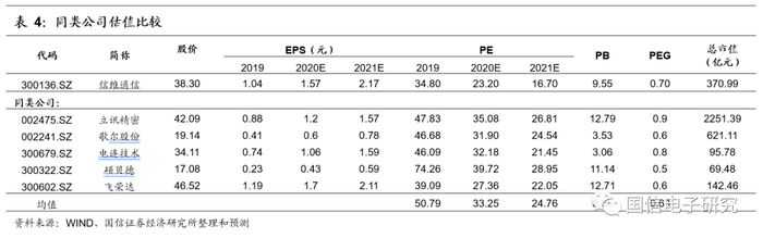 选取与公司相近的消费电子零部件的国内公司做比较,采用PE法估值。公司定增融加码5G射频项目,沿着原有既定产业升级方向往高端射频前端及高端连接器方向发展,致力成为全球领先的一站式泛射频平台型公司。公司客户优质,新品开始放量,盈利能力有所提升,一季度受疫情影响短期下游需求有短期的波动,但是随着复工的持续推进以及疫情的有效控制,对全年业绩冲击有限。