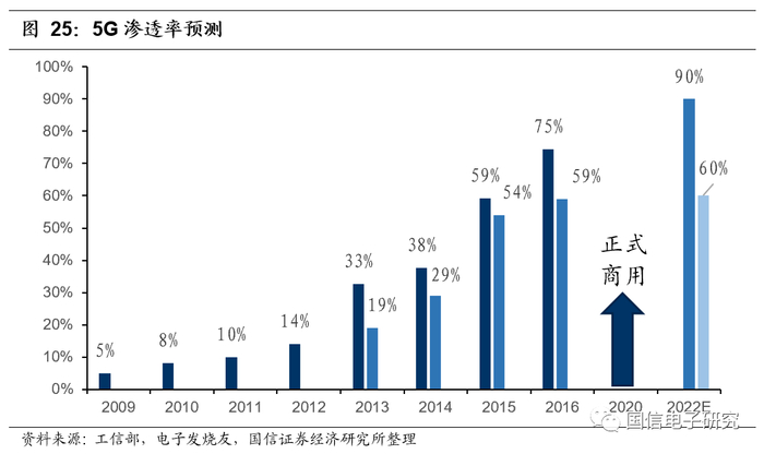 工信部发放牌照对5G渗透率提升作用最为明显,4G时代工信部于2013年底对运营商发放牌照,牌照发放后,4G用户迅速增多,4G在智能手机中的普及率呈爆发式增长。到2016年底,4G用户达到7.7亿,渗透率达59%。根据中国移动此前透露5G建设时间表,到2020年达到全网万站规模,能够实现商用产品规模部署,预测5G牌照于2019年底至2020年初发放,按照4G渗透率增速,2022年5G用户渗透率有望达到60%左右。