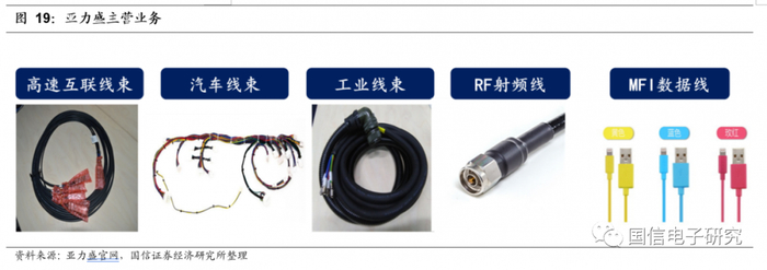 亚力盛是国内著名连接器生产厂商,成立以来专注于各类连接器的研发、生产和销售。产品包括工业自动化类和消费类,工业自动化类连接器用于富士康等移动终端制造基地的产品性能测试;消费类连接器包括Wire Harness,苹果MFI认证数据线等,并正在研发汽车线束,用于连接车载导航系统、音频、视频系统。