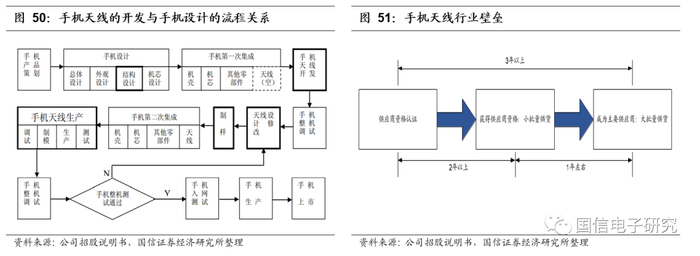 天线行业设计需要与手机厂商紧密互动,增加行业进入壁垒。与横向其他公司产品如声学器件、电池等相比,移动终端天线更加复杂、通用性更低且容易受终端其他零部件如机身设计影响,故移动终端天线需要在客户移动终端整机环境下设计、开发与调试,并充分考虑其他部件对天线系统的影响,对设计所需经验要求较高。且天线对手机使用体验影响巨大,一旦天线出现不稳定将使客户产生巨额损失,因此终端客户对于天线厂商资质审核更加谨慎,从拿到供应商认证资质到批量供货一般需要三年左右时间,因此客户粘性更大、行业壁垒更高。
