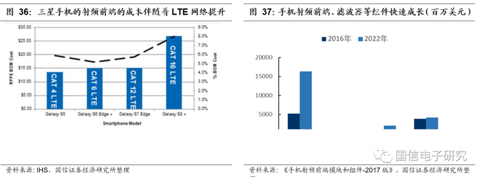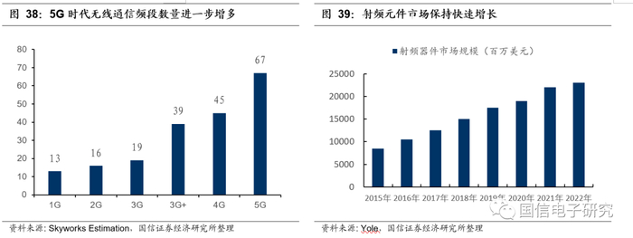 高频段促使射频元件结构升级。随着4G日渐成熟,5G越来越近,技术上而言,5G 通信的三大变化为:1、使用了更多的通讯频段;2、使用 MIMO 多天线技术;3、使用载波聚合技术。射频系统也需要做出相应变化。由于频率提高,射频元件与4G时代最大不同就是需要采用更高频电路。材料方面,采用传统Si材料的功率放大器的增益会随着频率的增加而大幅降低,不能满足5G高频通信的要求,GaAs及GaN在高频领域优势明显,有望成为5G时代主流功率放大器选择。射频前端总市场规模2022年有望达到227亿美元,复合增长率14%。