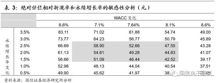 该绝对估值相对于WACC和永续增长率较为敏感,表3是公司绝对估值相对此两因素变化的敏感性分析,