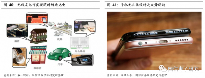 无线充电即不需充电线即可实现终端设备的电力传输,其最大优点是可以摆脱充电线的限制,可实现终端的随时随地充电;同时无需充电接口,可省去充电接口、线缆的空间,因此能更好满足防尘防水、美观的需求。苹果自iphone 7起,即取消耳机插孔,从而获得更加对称的外观、更好的防水防尘效果,目前越来越多厂商开始跟随取消耳机插孔设计。